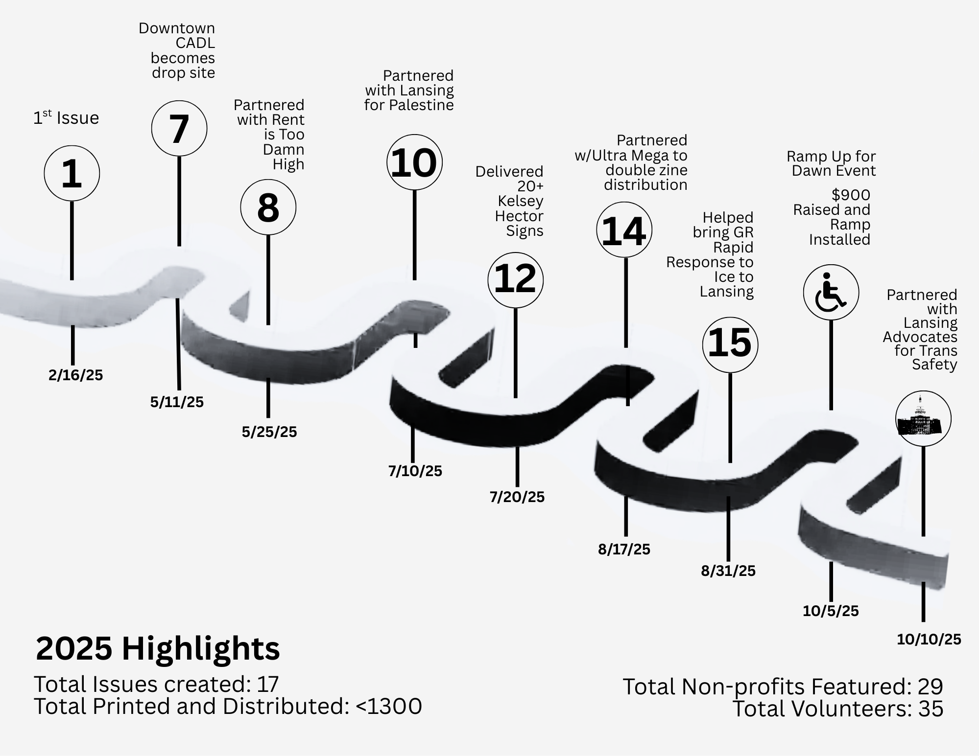 We print through Ultra Mega, a local community print shop. We currently produce 144 copies an issue for approx. $50. At two issues a month, this brings our total to $100 a month.